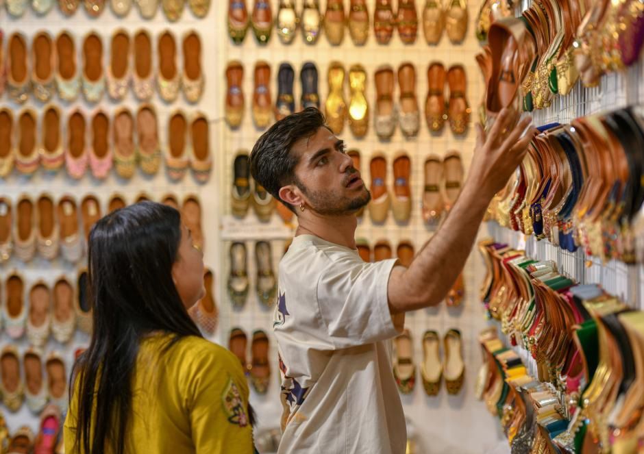 6月19日,在第9届中国—南亚博览会,巴基斯坦展区的参展商(右)向一名顾客推介特色鞋。(新华社)