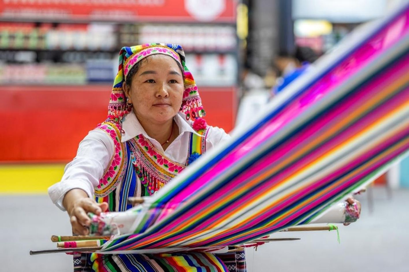 6月19日,一名独龙族妇女在第9届中国—南亚博览会上织独龙毯。(新华社)