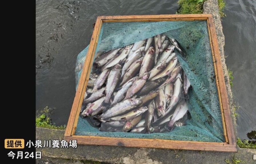 小泉川养鱼场利用来自大山的河水养殖虹鳟和红点鲑鱼。6月24日当天清晨,准备出货的约2吨虹鳟和红点鲑鱼共计约1000条鱼发生大量死亡。
