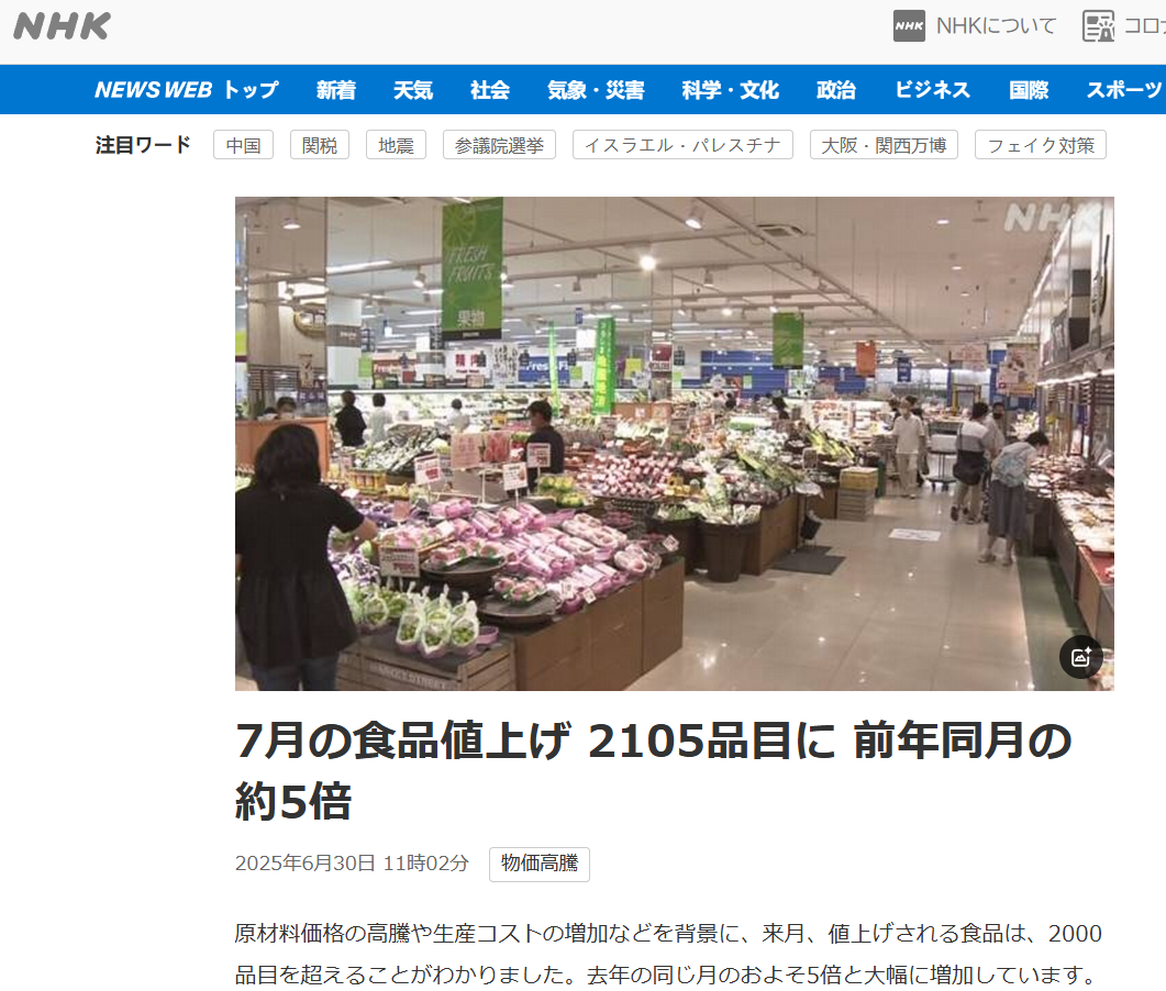 NHK6月30日报道,民间调查公司“帝国数据银行(帝国Databank)”以日本195家主要食品制造商为对象进行的调查显示,日本7月涨价食品将达到2105种。