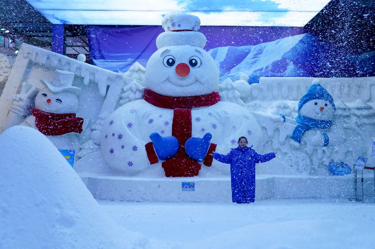 此外,馆内还设有彩色溜冰区和互动戏雪区,现场雪花纷纷飘落,犹如回到隆冬时节。值得一提的是,馆内的游览路线上分布多组栩栩如生的熊猫冰雕,游客可以在此与“国宝”共赴冰雪之旅。