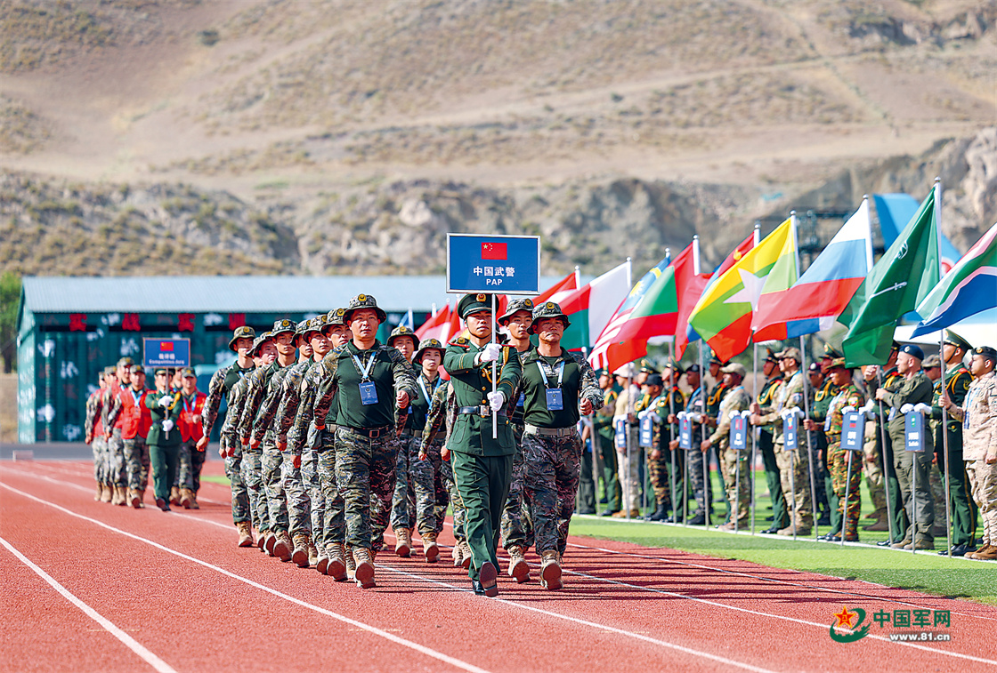 开幕式上,中国武警参赛队员整齐列队,步入现场。