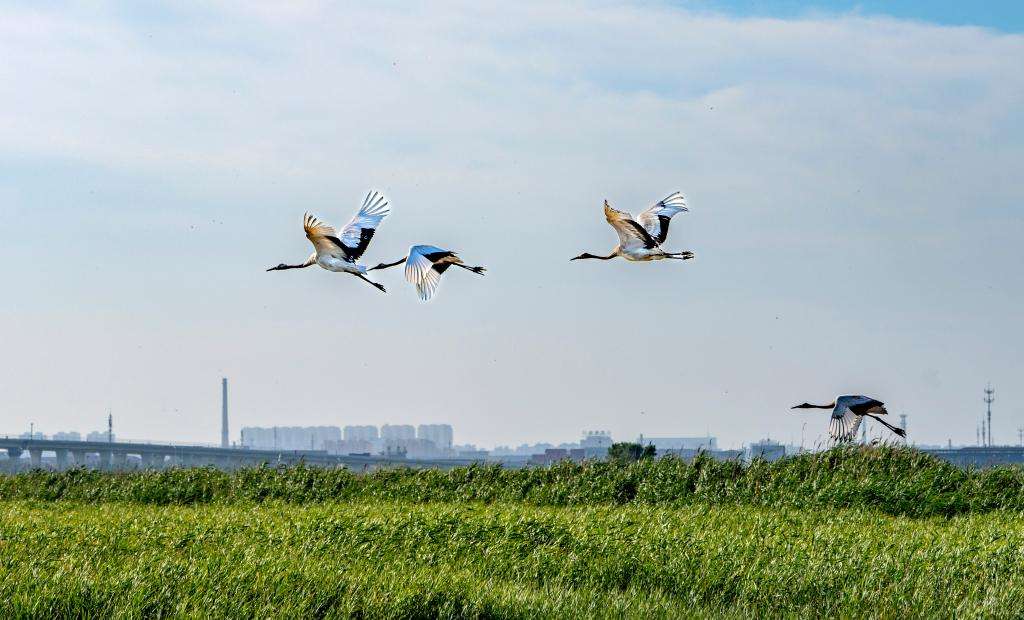 图为丹顶鹤在中国辽宁省营口永远角湿地仙鹤湾上空飞翔。(图/新华社)
