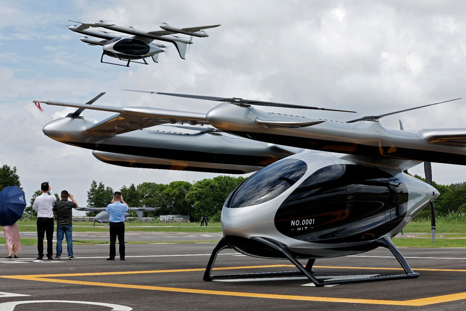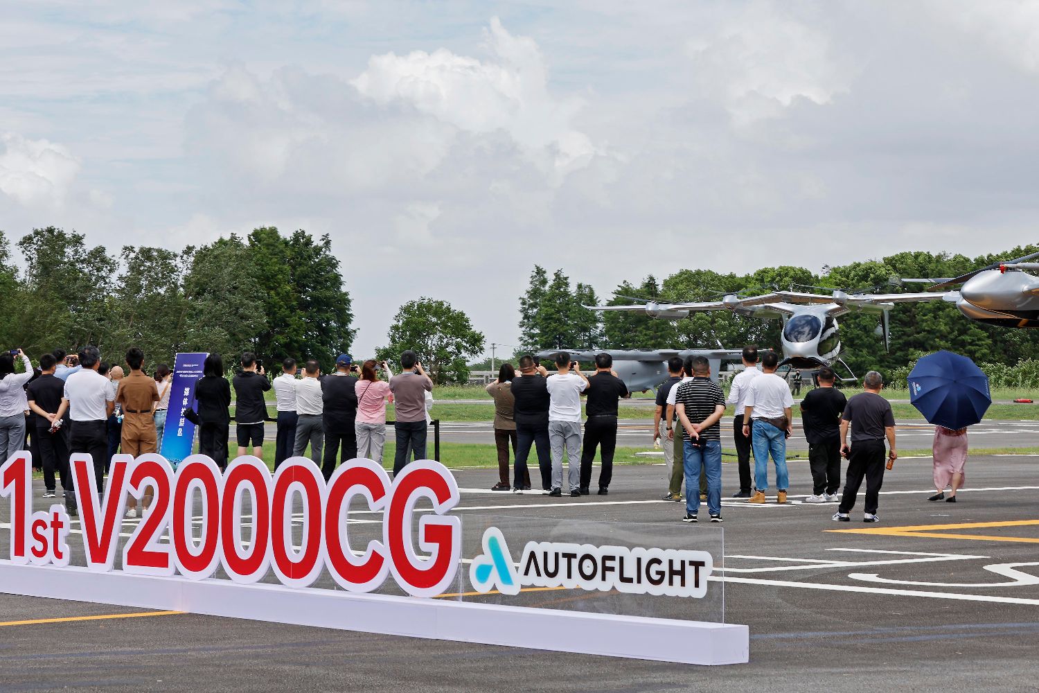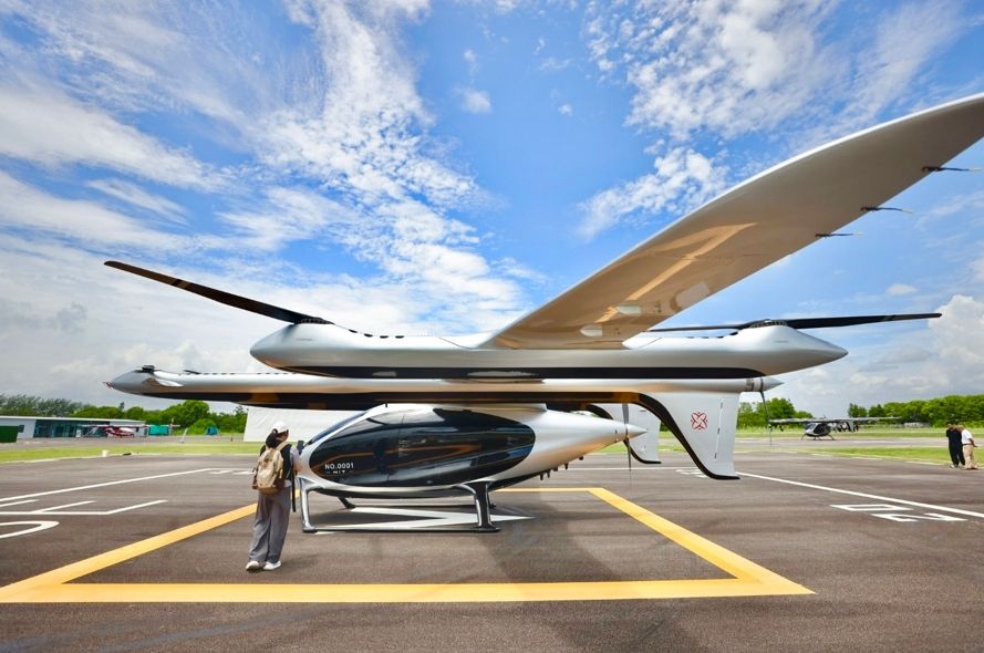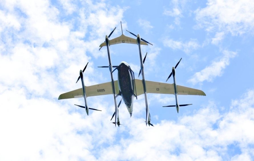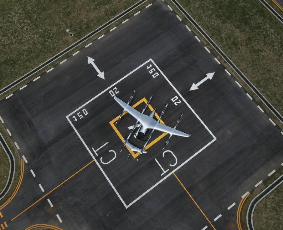 空中俯瞰停在机坪上的V2000CG凯瑞鸥电动垂直起降航空器(无人机照片)。(新华社)