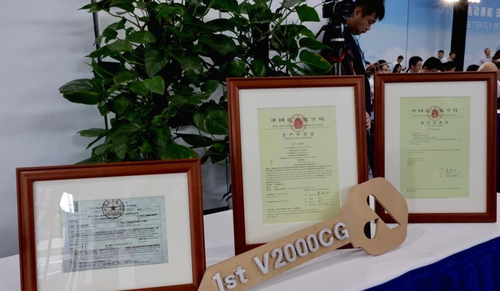 这是在交付仪式现场展示的V2000CG凯瑞鸥电动垂直起降航空器的“适航三证”。(中新社)