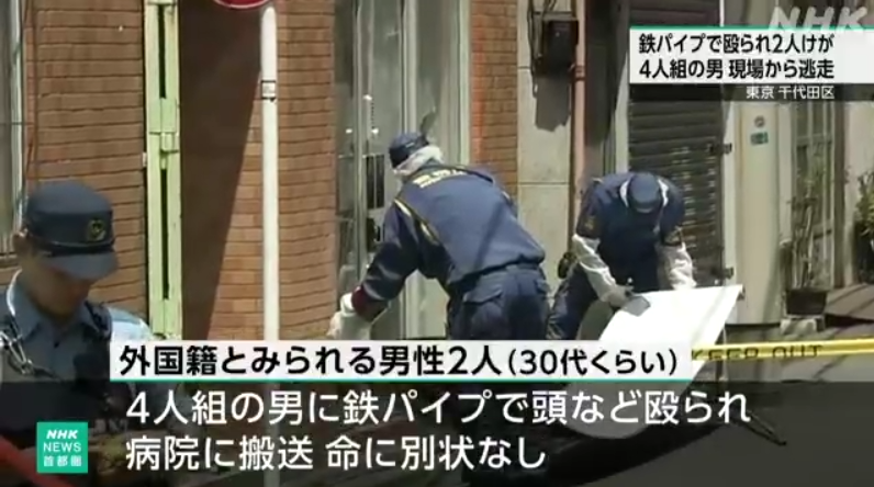 7月31日上午,两名中国籍男子在JR神田站附近行走时,突然被4名男性用铁管袭击受伤。(图/NHK视频截图)