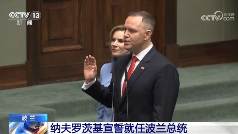 纳夫罗茨基6日宣誓就任波兰总统。(图/中国央视新闻视频截图)