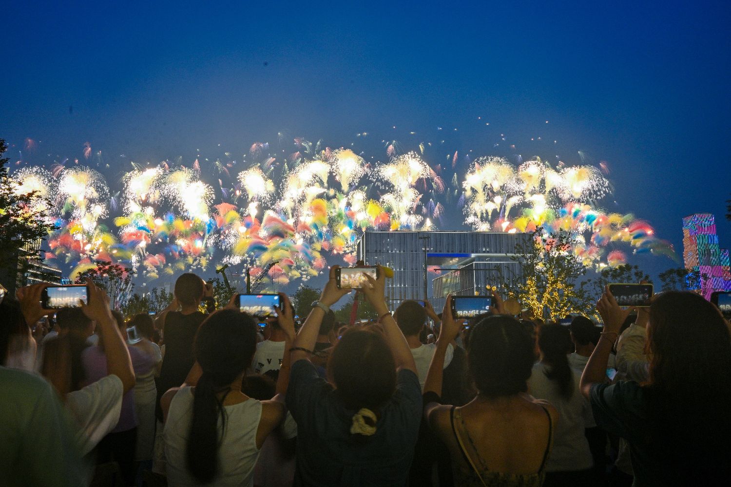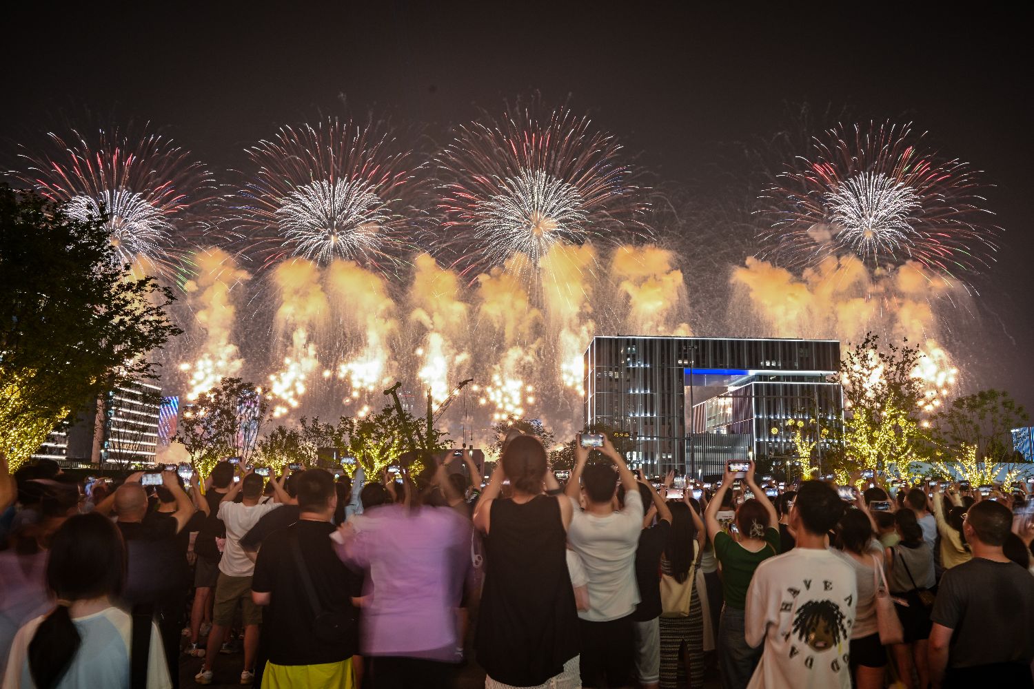 8月7日,第12届世界运动会开幕式在四川成都举行。图为开幕式上的焰火表演引民众观看。(中新社)