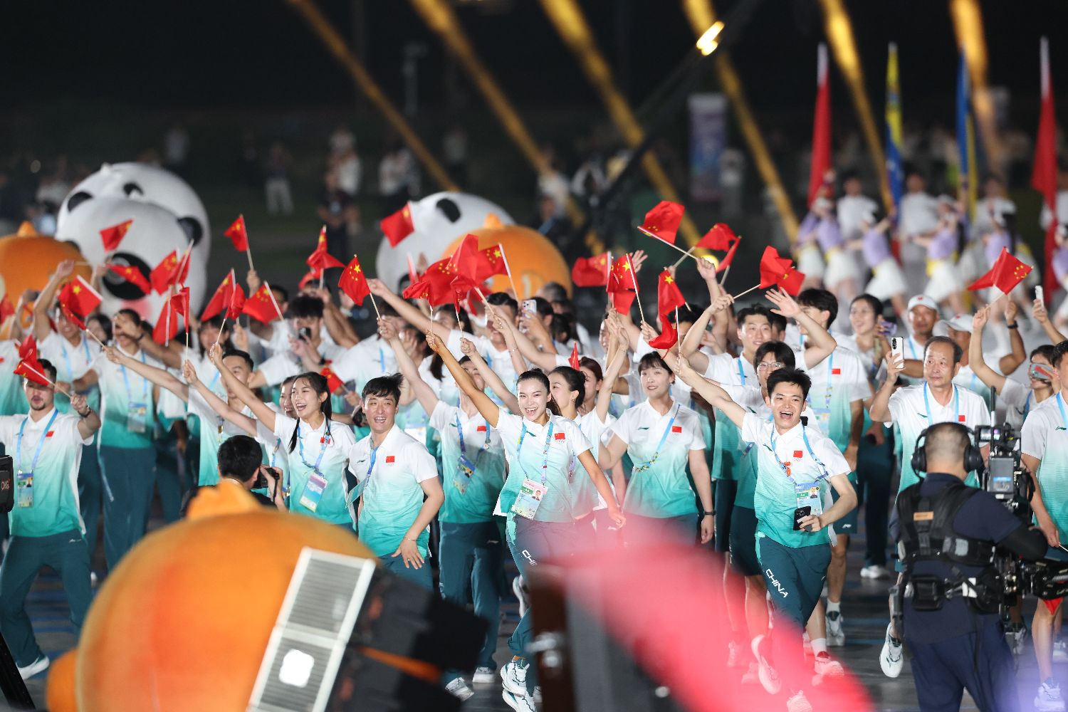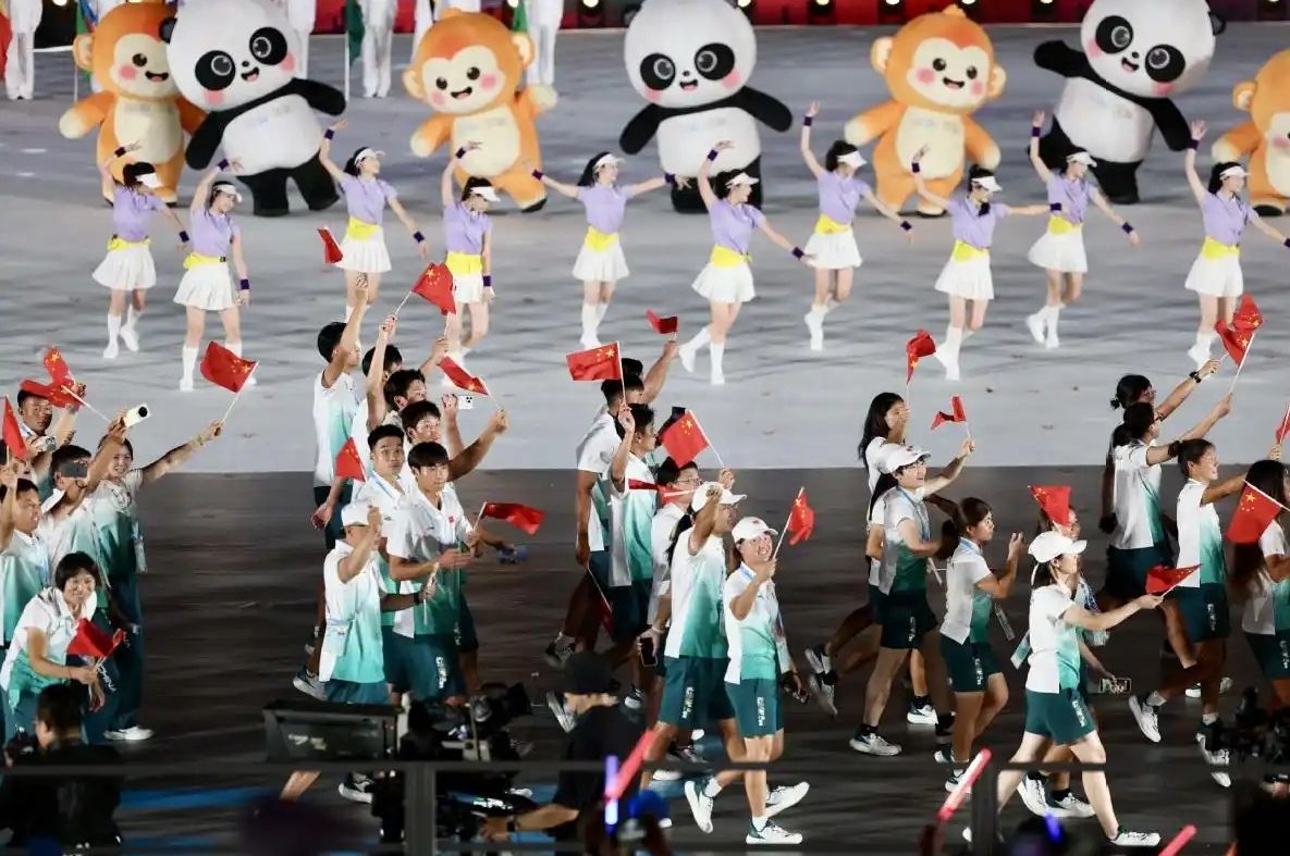 8月7日,志愿者和吉祥物在开幕式上欢迎体育代表团入场。(中国日报网)