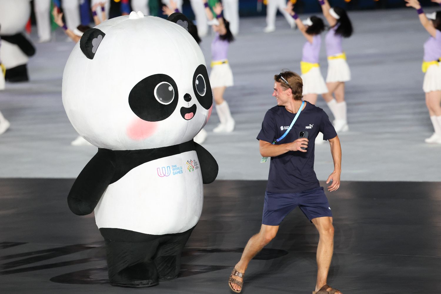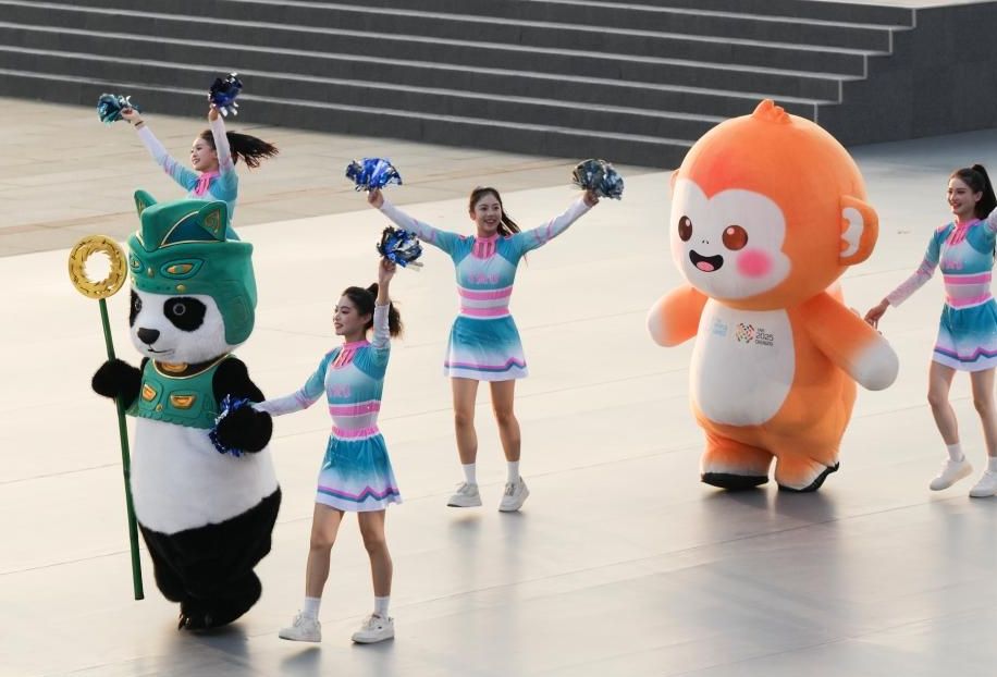 图为运动员与成都世运会吉祥物“蜀宝”互动。(中新社)