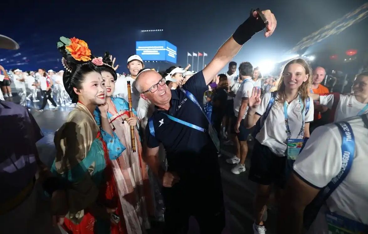 8月7日,开幕式后,一名外国代表团成员与开幕式演员自拍留影。(中国日报网)