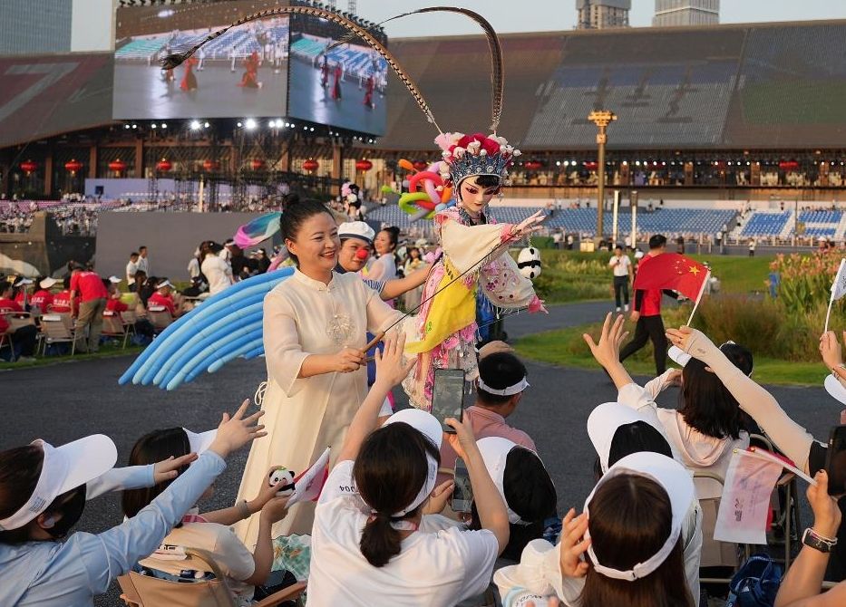 8月7日,演员在开幕式前进行暖场表演。(新华社)