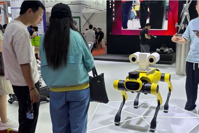 满电可续航6小时、工作中能承重40公斤,来自浙江中坚科技股份有限公司的四足机器狗灵睿P1可在多种应急场景中工作。该公司工作人员何婷介绍,灵睿P1是机器狗中的“大块头”,相较小型和中型机器狗电机寿命更长,续航时间更久,承重力更强,更为适合工业巡检的环境和要求。