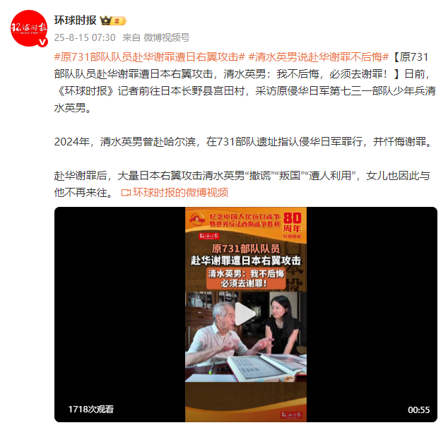 原731部队队员赴华谢罪遭日本右翼攻击,清水英男:我不后悔,必须去谢罪!
