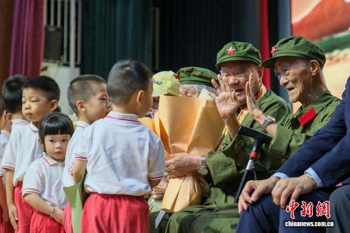 伴随着雄壮的《义勇军进行曲》,活动正式拉开序幕。会场上,香港青少年制服团体成员整齐列队,迈步走上台,向老战士行礼。10多名儿童手捧鲜花,快步跑到台前献给老战士们。