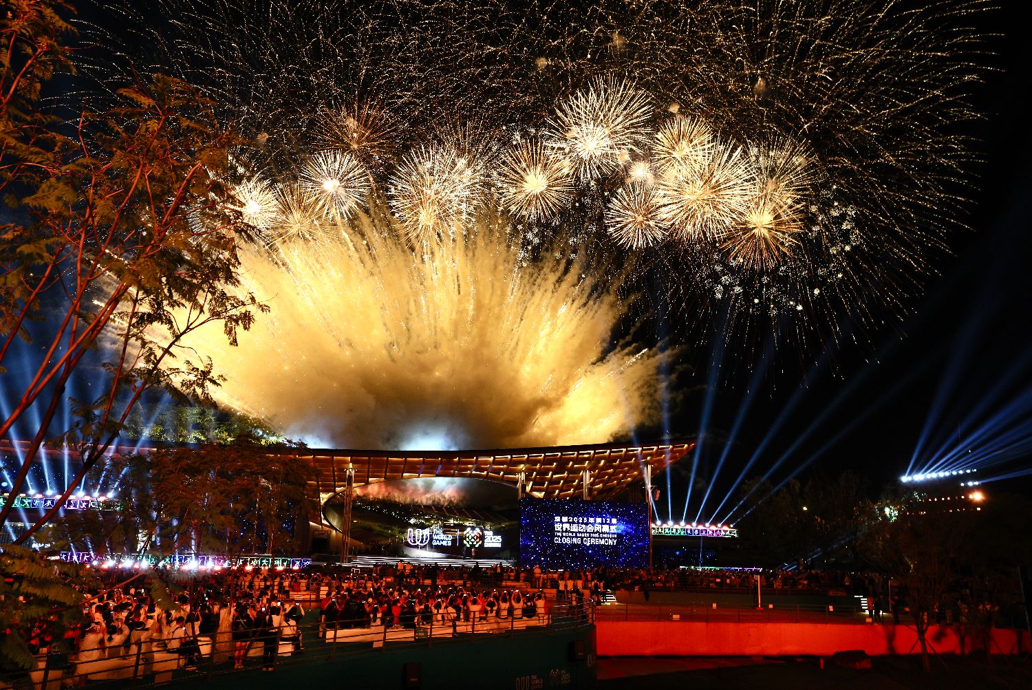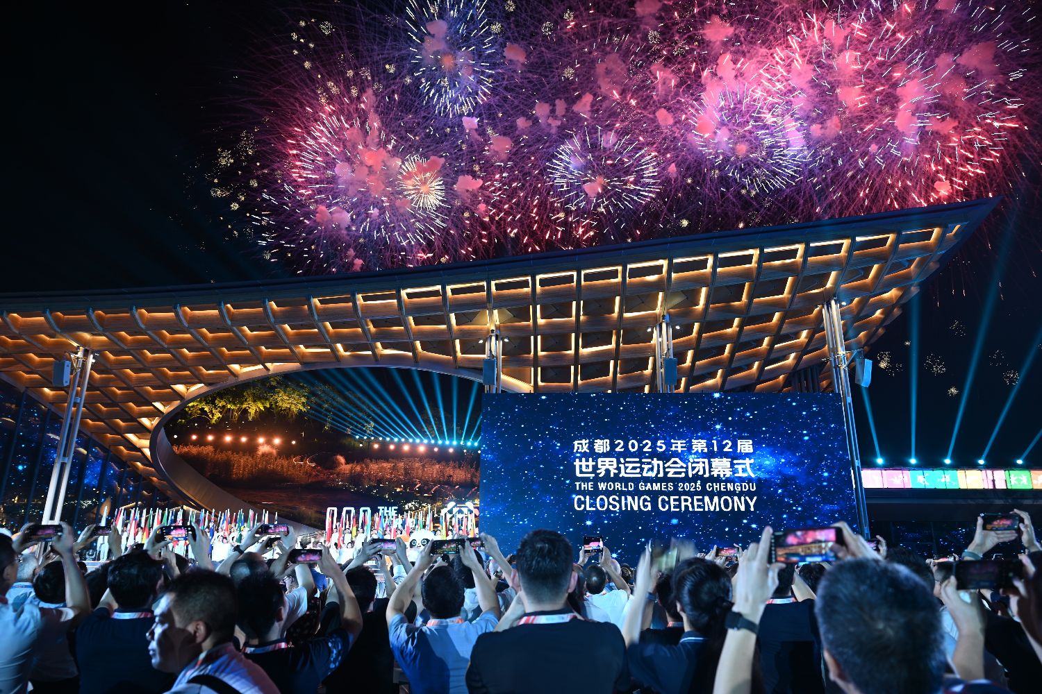 运动无限,气象万千。第十二届世界运动会8月17日在中国四川成都圆满闭幕。没有选择传统体育场馆,闭幕式在成都世园会举行,主舞台依山而建,夜雨过后,灯光璀璨,仿佛凌空于山林的水晶宫殿。本次闭幕式以“同球共济”为主旨,贯彻“绿色、共享、开放、廉洁”办赛理念和“简约、安全、精彩”办赛要求,体现国际表达、中国风格、巴蜀特色。在浓缩了成都世运会高光时刻和人文记忆的赛事回顾视频中,闭幕式拉开帷幕。在这座繁花与绿意织就的园林,让世界共享中国的诗意与浪漫。图为闭幕式上的焰火表演。(中新社)