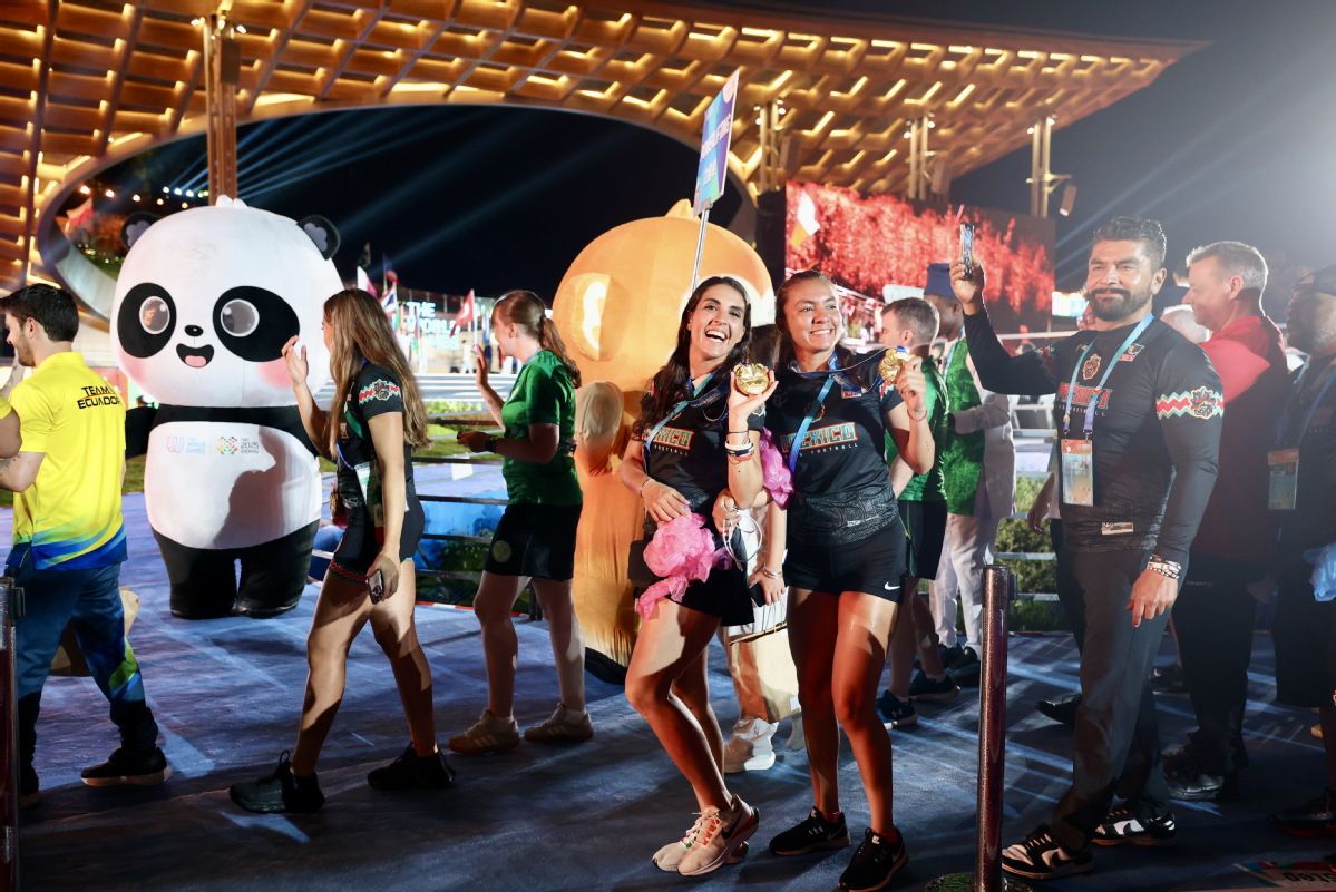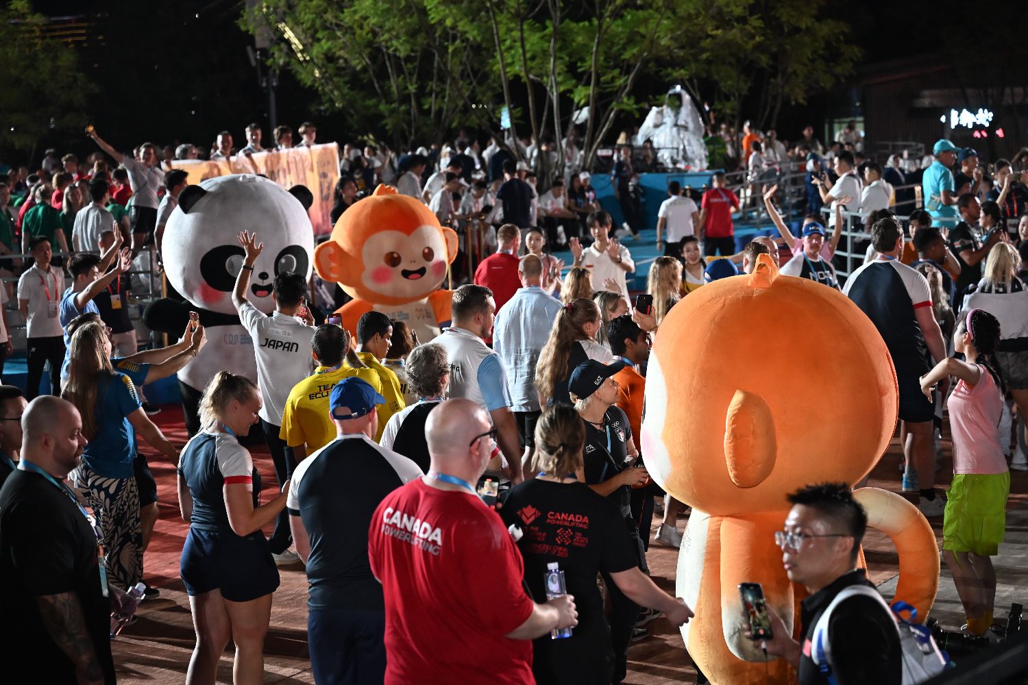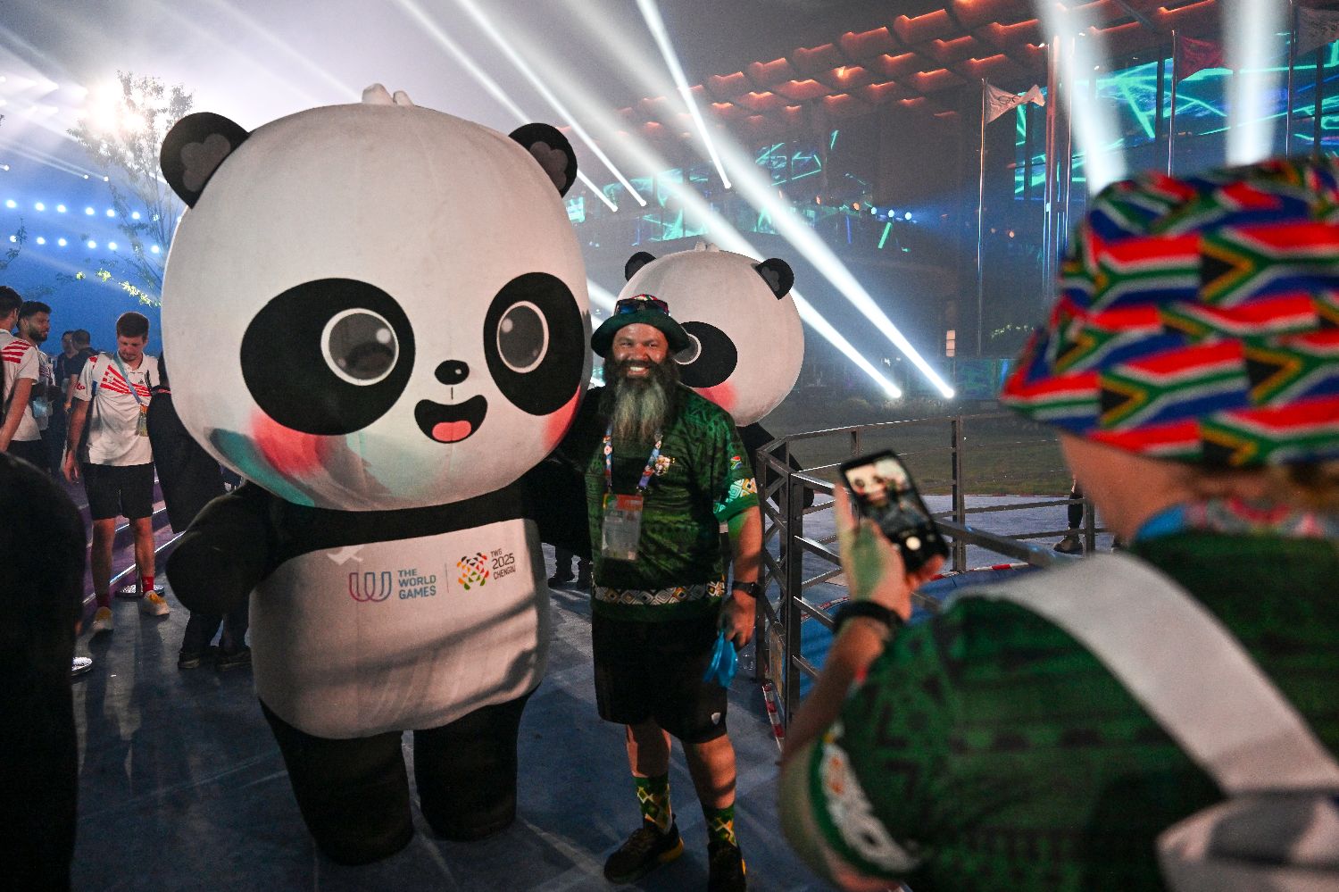 图为运动员在闭幕式上与本届世运会吉祥物“蜀宝”合影。(新华网)