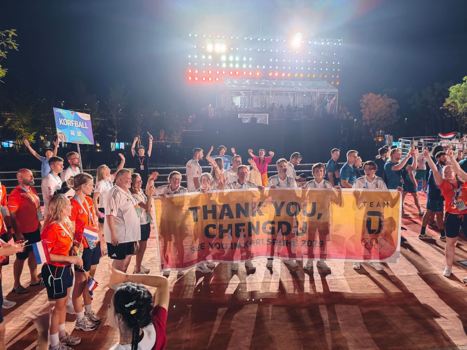 图为运动员手举“Thank you Chengdu”的横幅。(中新社)
