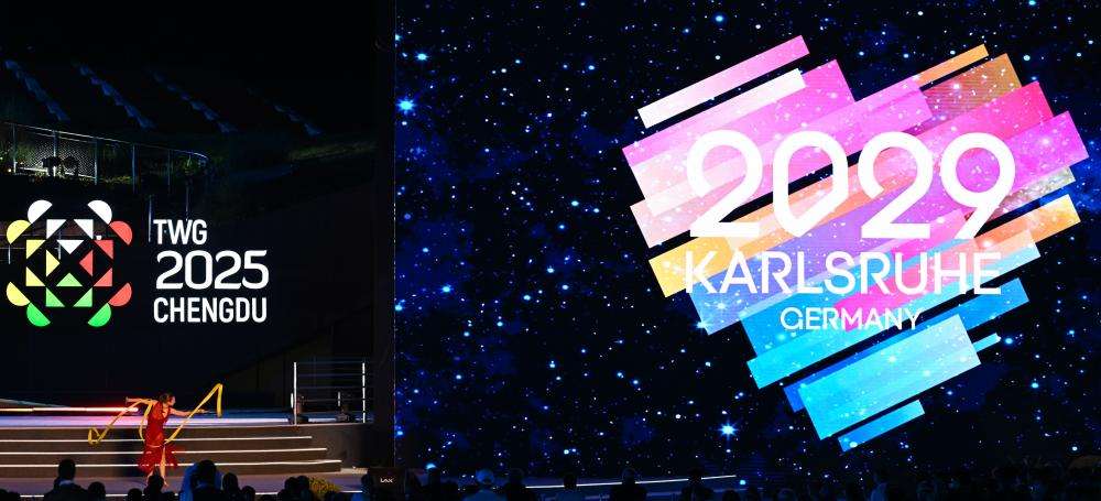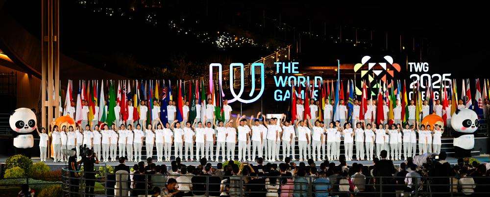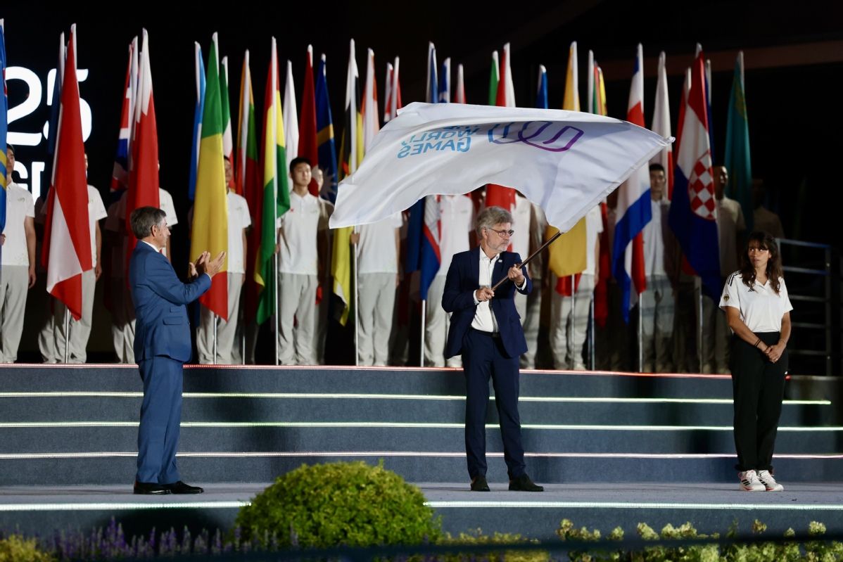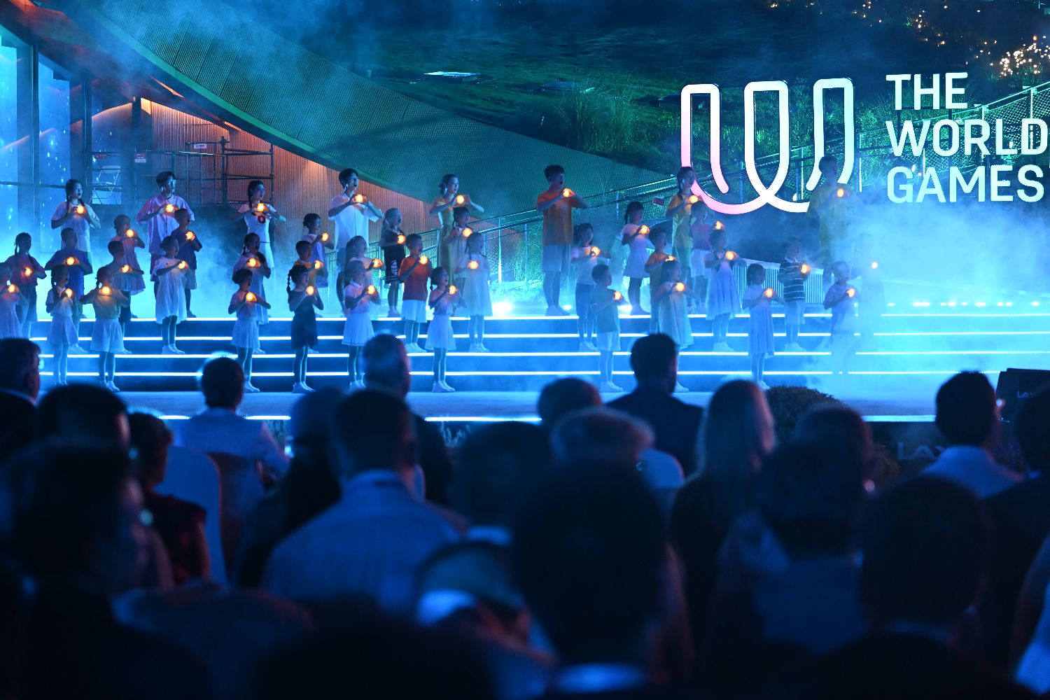 图为闭幕式上拍摄的国际世界运动会协会会旗交接仪式。(中国日报网)