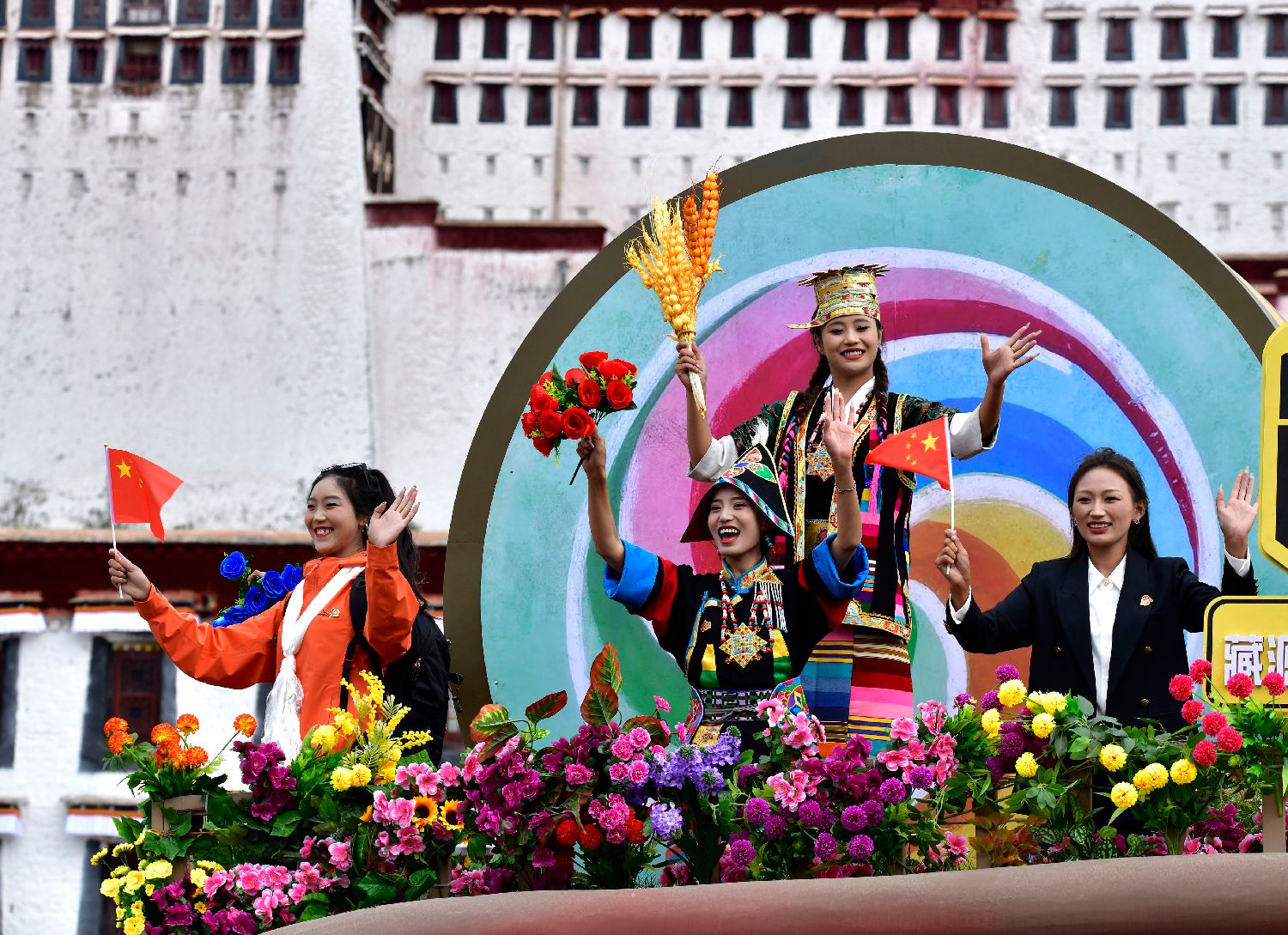 8月21日,西藏自治区成立60周年庆祝大会在拉萨布达拉宫广场举行。图为庆祝大会举行盛大的群众游行。(图/中新社)