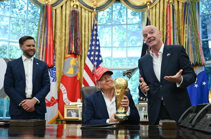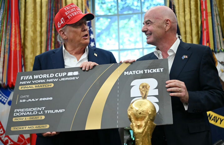 “不过因凡蒂诺还是确保总统不会空手而归”,《野兽日报》称。作为“补偿”,因凡蒂诺向特朗普赠送了明年世界杯决赛巨型纸质版的首张门票,并暗示表现平平的美国男足有望赢得明年夏天的比赛。报道称,虽然因凡蒂诺婉拒特朗普拿走“大力神杯”,但特朗普此前已将2025世俱杯冠军的奖杯放在椭圆形办公室里展示,迫使冠军切尔西俱乐部只能用复制品奖杯代替。