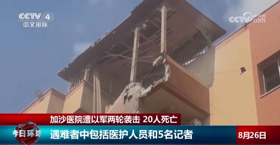 以色列军队25日两次袭击了位于加沙地带南部汗尤尼斯的纳赛尔医院,造成包括5名记者在内的至少20人死亡。(图/中国央视新闻视频截图)