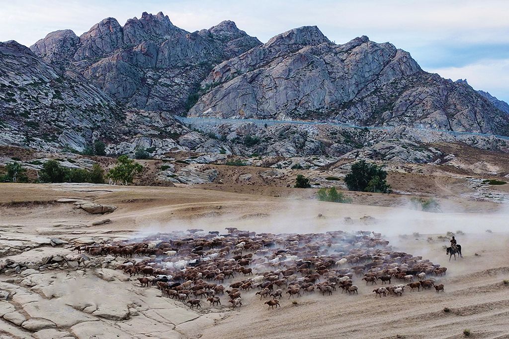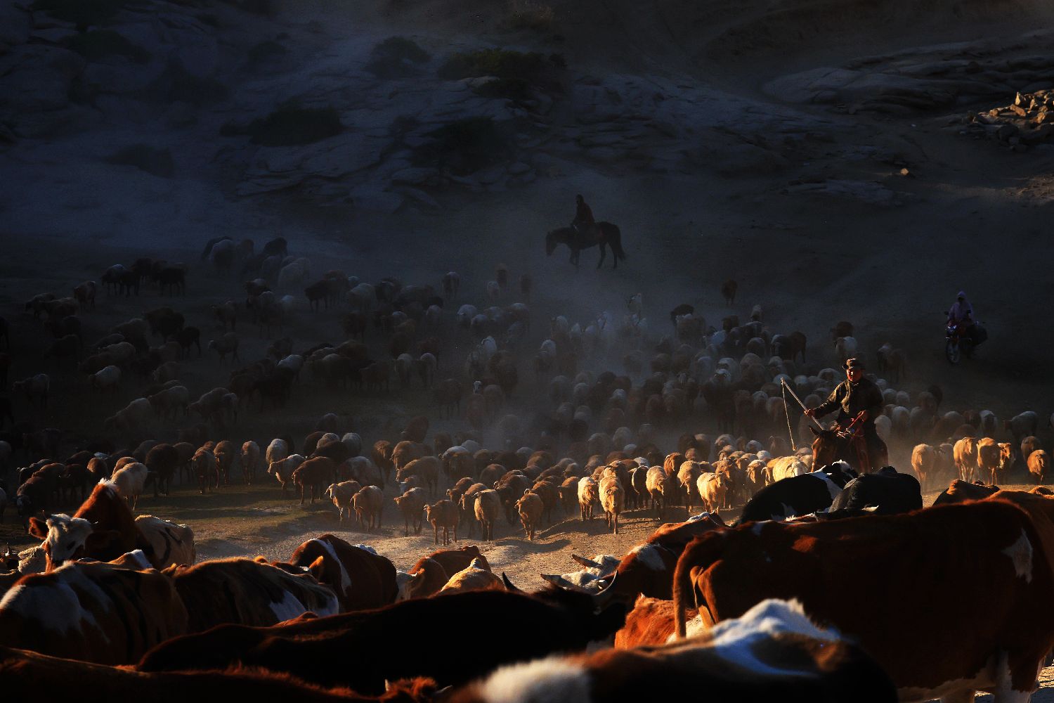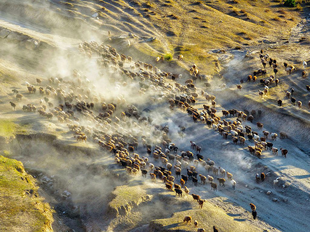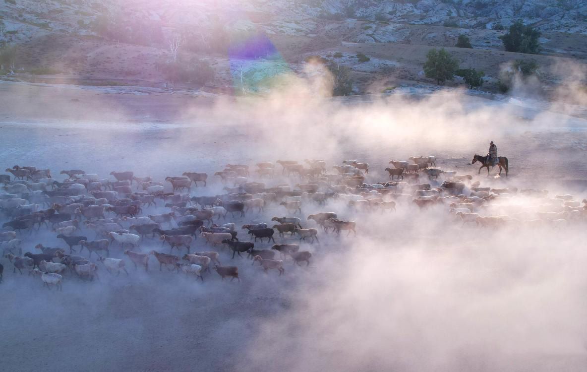 8月24日,新疆阿勒泰地区福海县牧民正赶着牲畜前往冬牧场途中。(CFP)