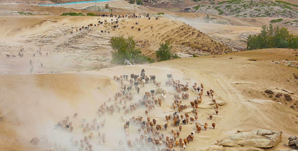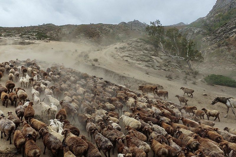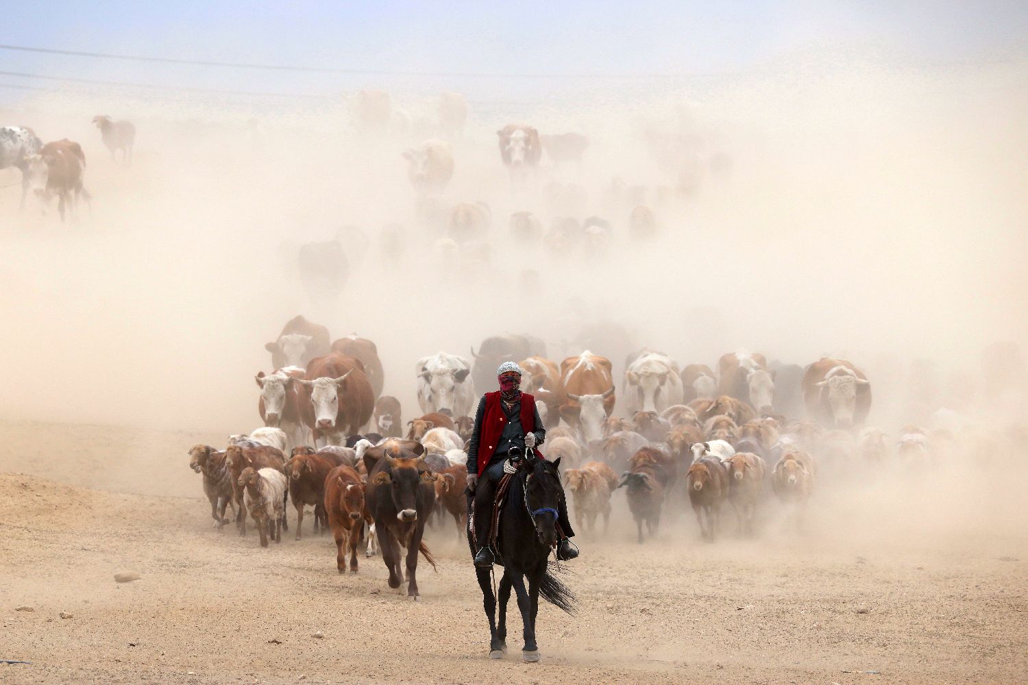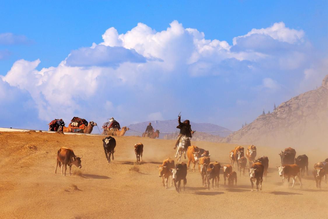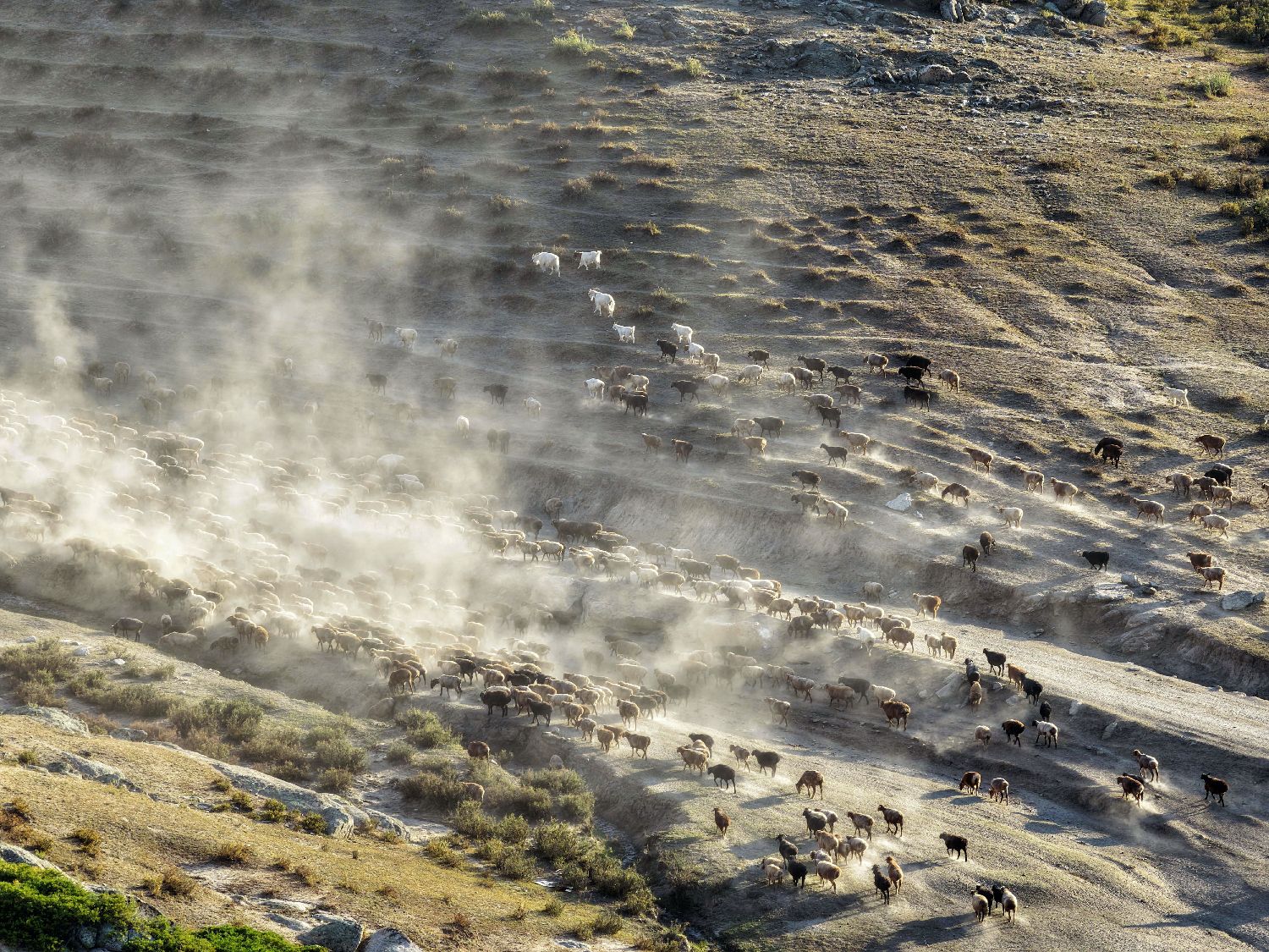 8月24日,新疆阿勒泰地区福海县牧民正赶着牲畜前往冬牧场途中。(CFP)