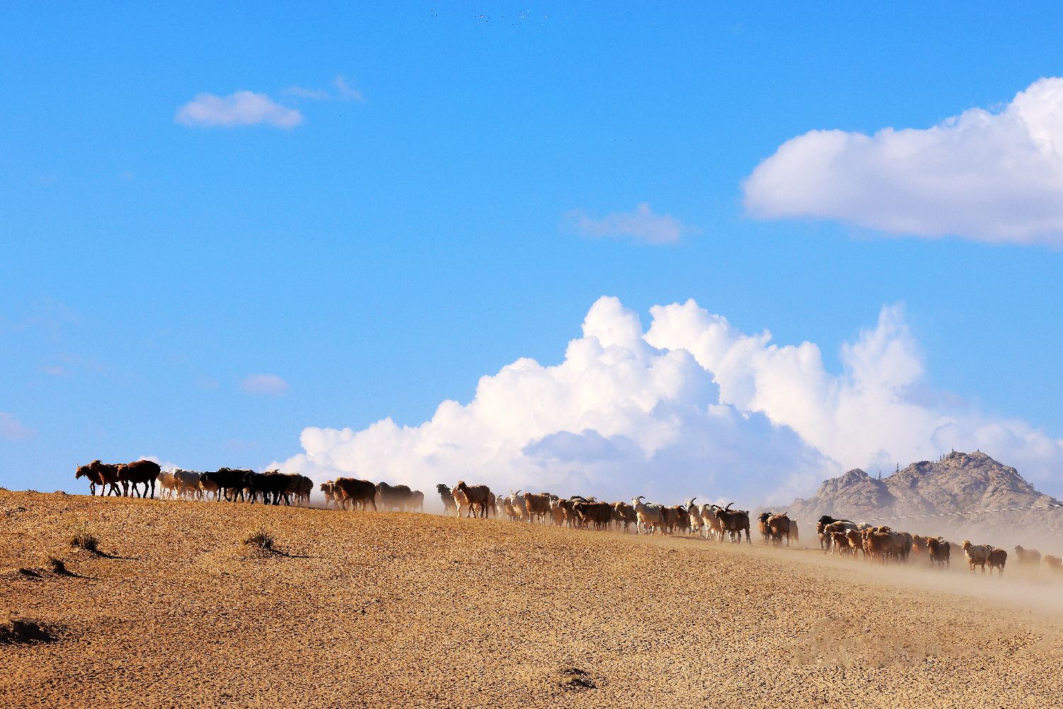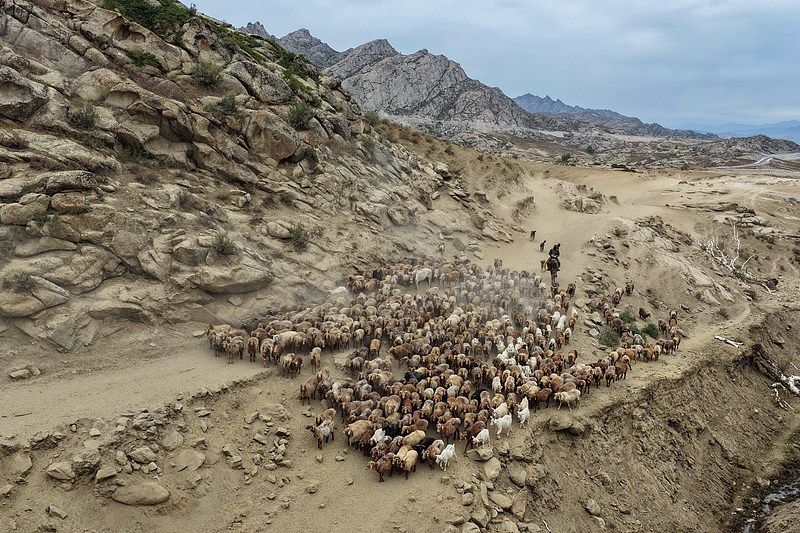 8月24日,新疆阿勒泰地区福海县牧民正赶着牲畜前往冬牧场途中。(中新社)