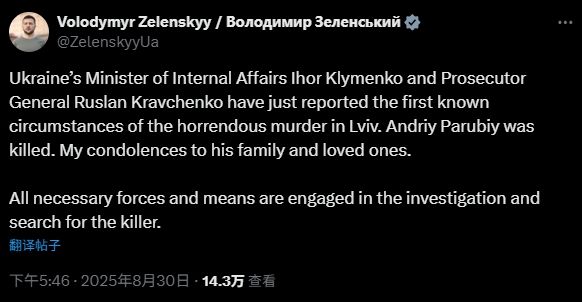“乌克兰内政部长伊霍尔·克莱缅科和总检察长鲁斯兰·克拉夫琴科刚刚汇报了利沃夫可怕谋杀的初步情况,”泽连斯基在X平台发文称,“安德烈·帕鲁比遇害。我向他的家人和亲人表示哀悼。”