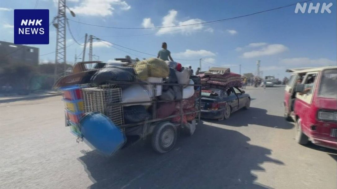 NHK加沙办事处于1日在加沙市和南部之间的主干道路中部努塞拉特附近进行了采访,发现装满水箱和家庭用品的卡车和马车正陆续向南行驶。