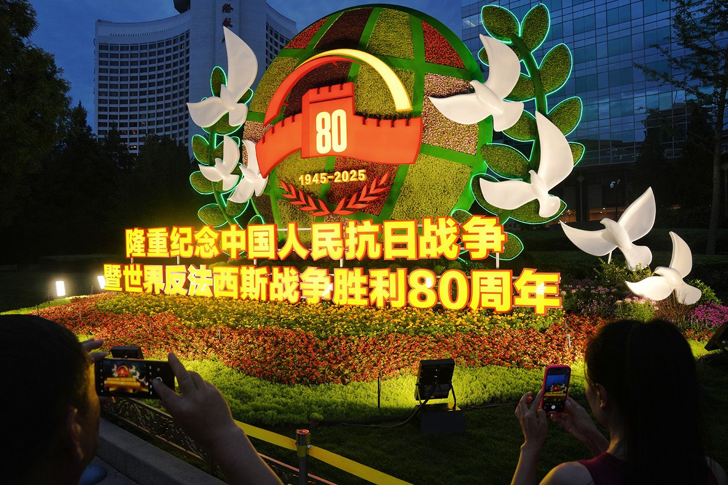 近日,亮灯的纪念抗战胜利80周年主题花坛扮靓北京长安街,吸引民众参观打卡。图为“众志成城”花坛。(中新社)