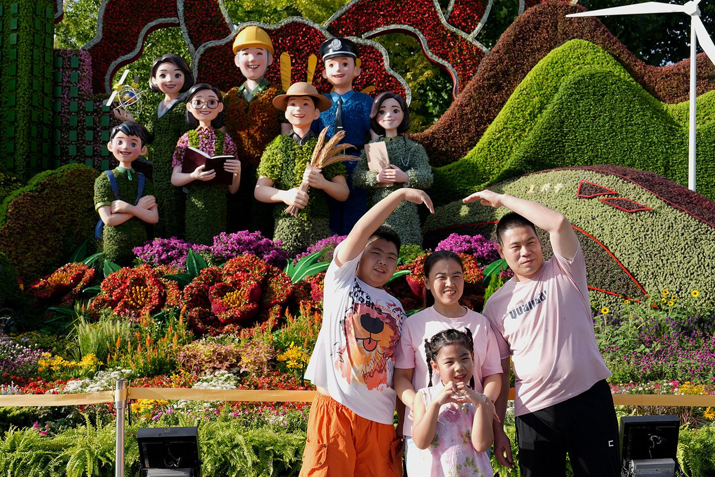 图为民众在“绿色生活”花坛前拍照打卡。(《北京日报》)