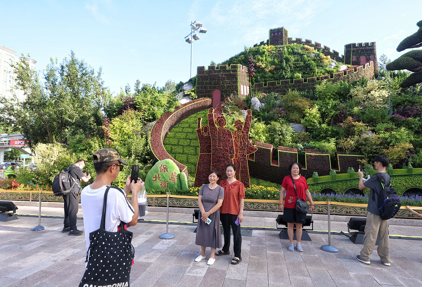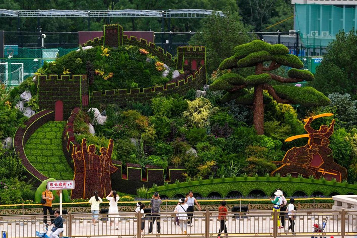 8月26日,人们在北京复兴门参观“美好明天”花坛。(新华社)