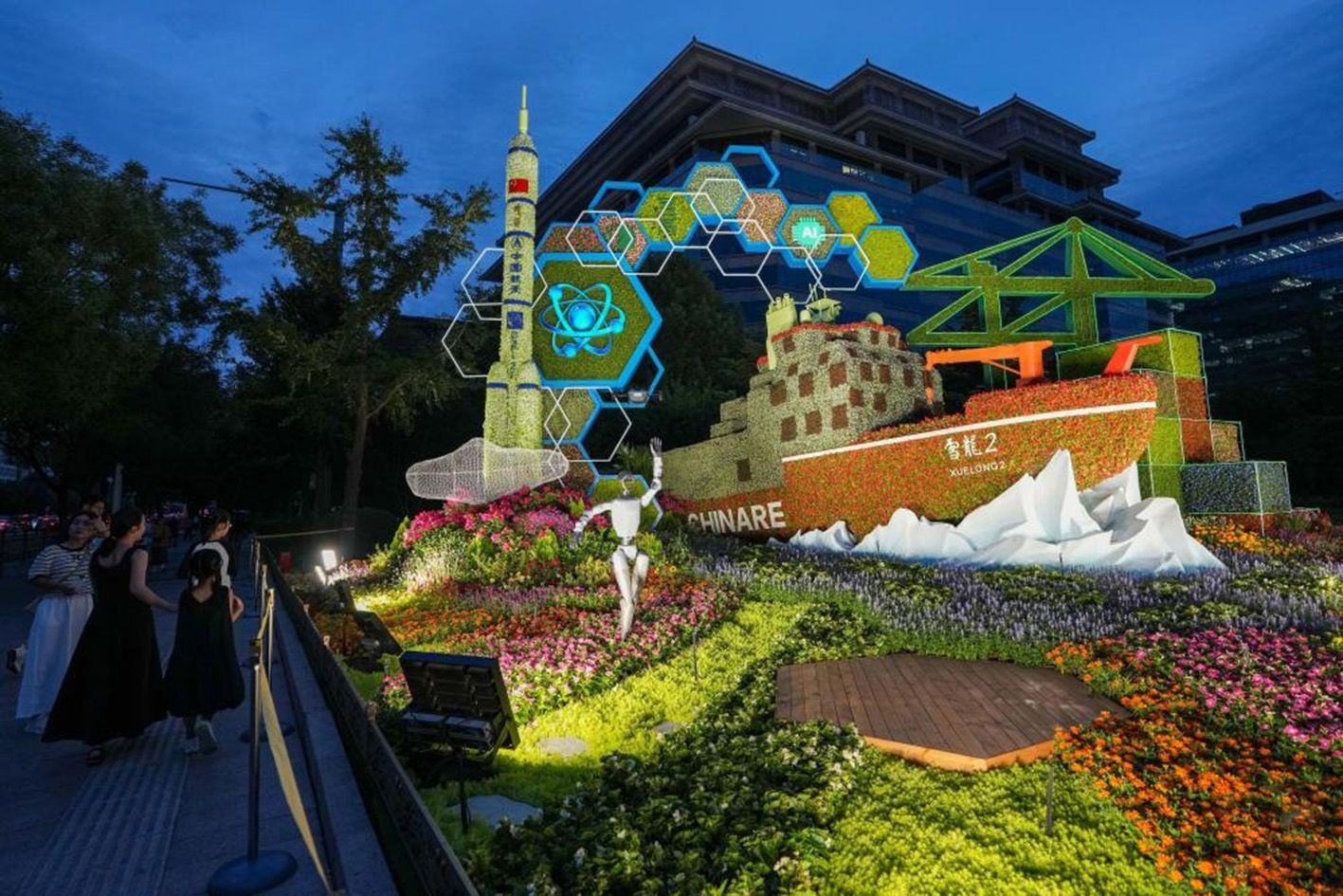 8月22日,人们在北京西单参观“科技强国”花坛。(新华社)