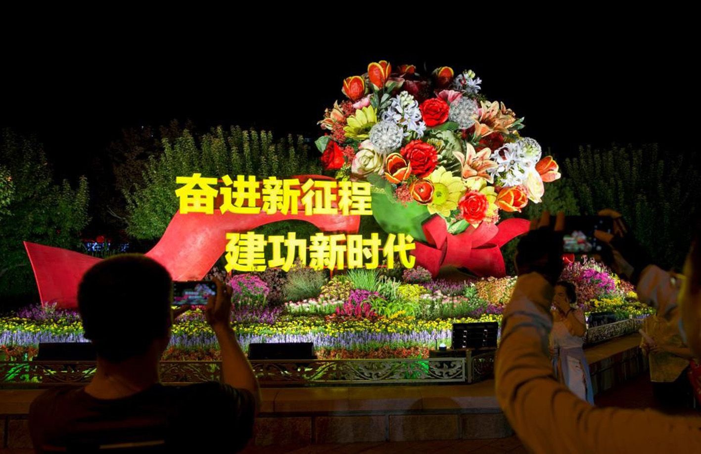 近日,西单东北角的“繁荣发展”花坛吸引市民驻足参观、打卡拍照。(中新社)