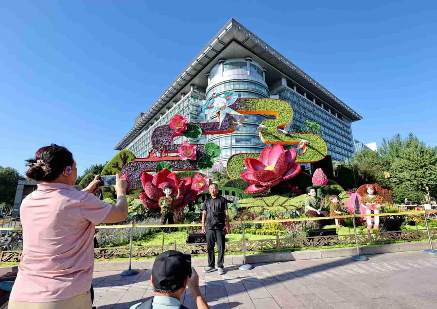 近日,北京长安街沿线的纪念抗战胜利80周年主题花坛吸引市民驻足参观、打卡拍照。据北京市园林绿化局介绍,长安街沿线以“铭记历史、缅怀先烈、珍爱和平、开创未来”为主题,从建国门至复兴门布置10组立体花坛,生动展现80年来,伟大的中国人民前仆后继、不屈不挠、顽强奋斗,为实现强国建设、民族复兴伟业而不懈努力的伟大精神。