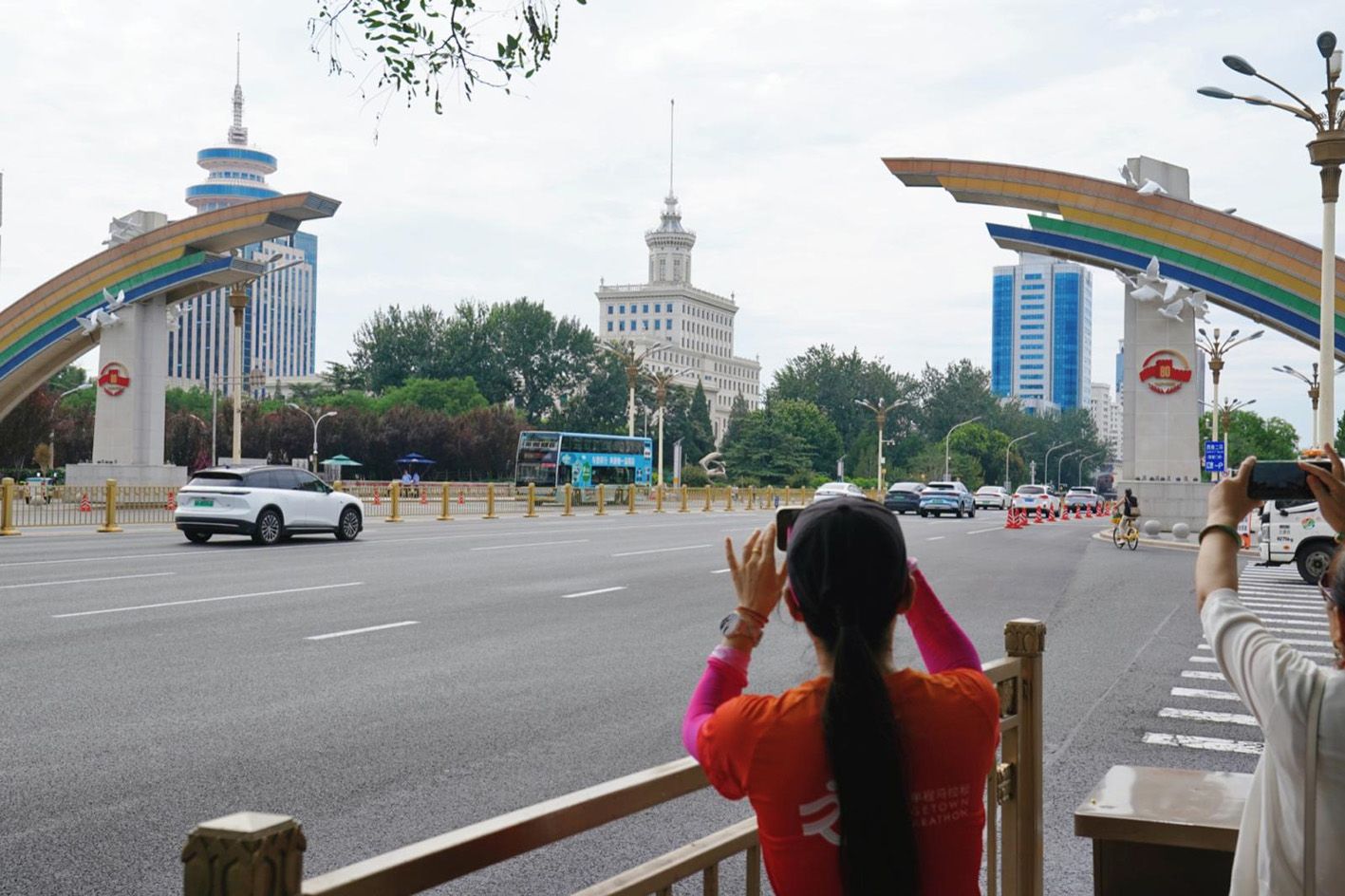 彩虹穹顶,14只和平鸽展翅翱翔,象征光明前景;立柱布置纪念活动标识,彰显仪式的庄严庄重。建国门和复兴门的两处彩虹门纪念主题景观,成为长安街一景。(《北京日报》)