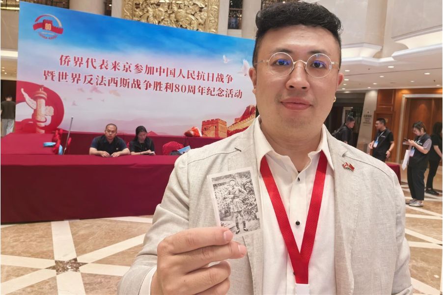 加拿大籍华人陈林带着姥爷的参军照观礼九三阅兵