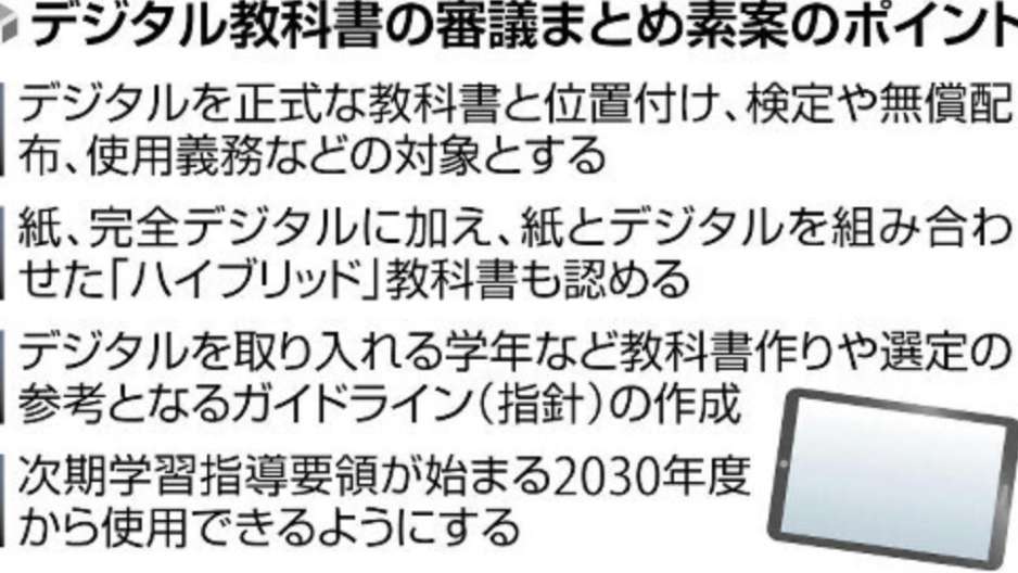 (亚太快讯消息)据读卖新闻报道,日本中央教育审议会数字教材推进工作组的审议总结草案于4日曝光,提出将纸质教材、完全数字教材以及纸质与数字结合的“混合型”教材,统一列为正式教科书,并纳入审定和使用义务范围。同时,草案要求制定指引,明确在不同学龄阶段如何引入数字教材。