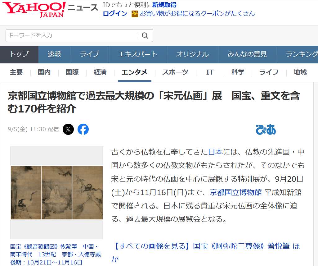 以宋、元时期佛画为中心的特别展览将于9月20日(周六)至11月16日(周日)在京都国立博物馆平成知新馆举办。(图/日本雅虎新闻网报道截图)
