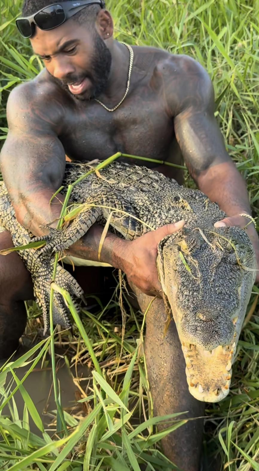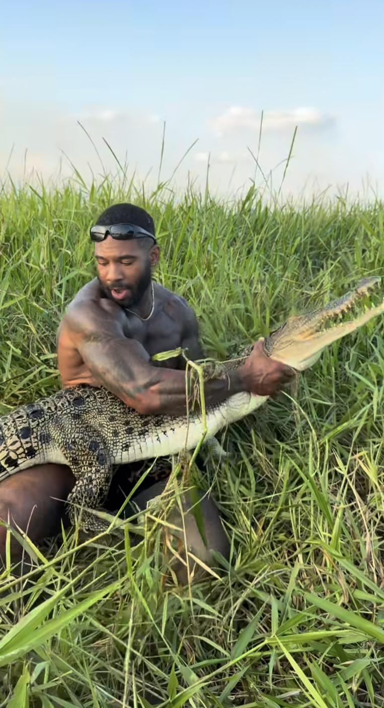霍尔斯顿正抓着一只鳄鱼的脖子。图源:霍尔斯顿社媒账号发布视频截图