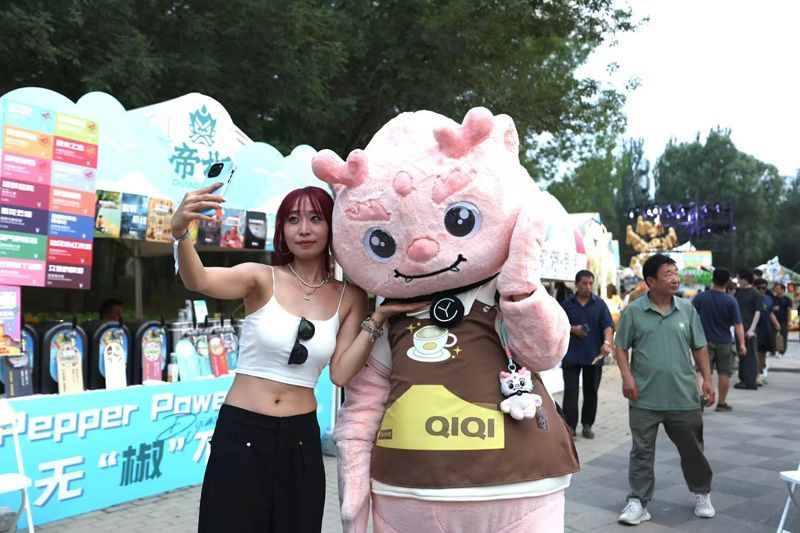 图为9月11日,市民与亮马河吉祥物“淇淇”合影留念。(北京《新京报》)