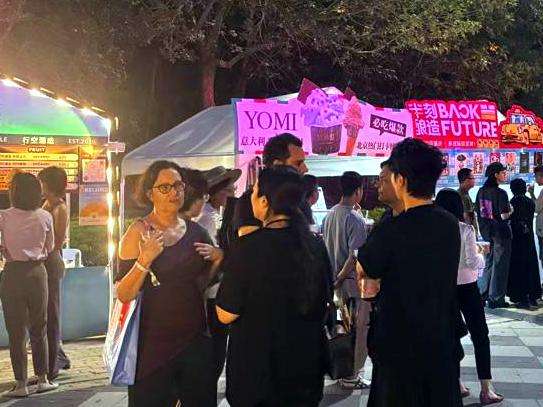 图为9月11日,在品尝精酿与美食之余,市民游客在草坪上沉浸式感受复古慢摇、爵士蓝调,放松身心。(中国网)
