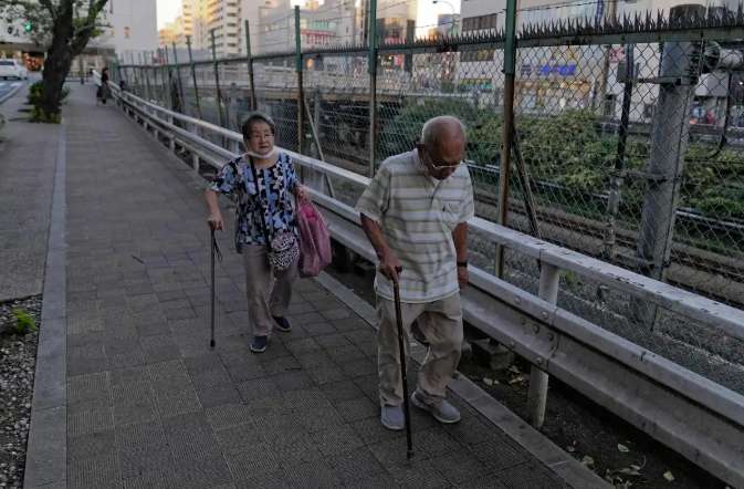 资料图:两位老人在东京巢鸭附近散步。(图/新华社)