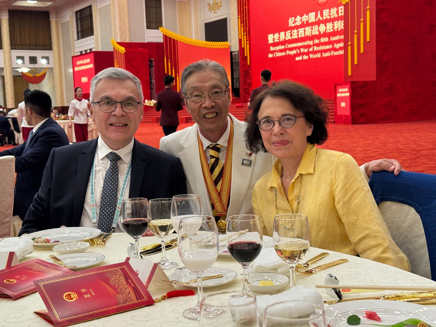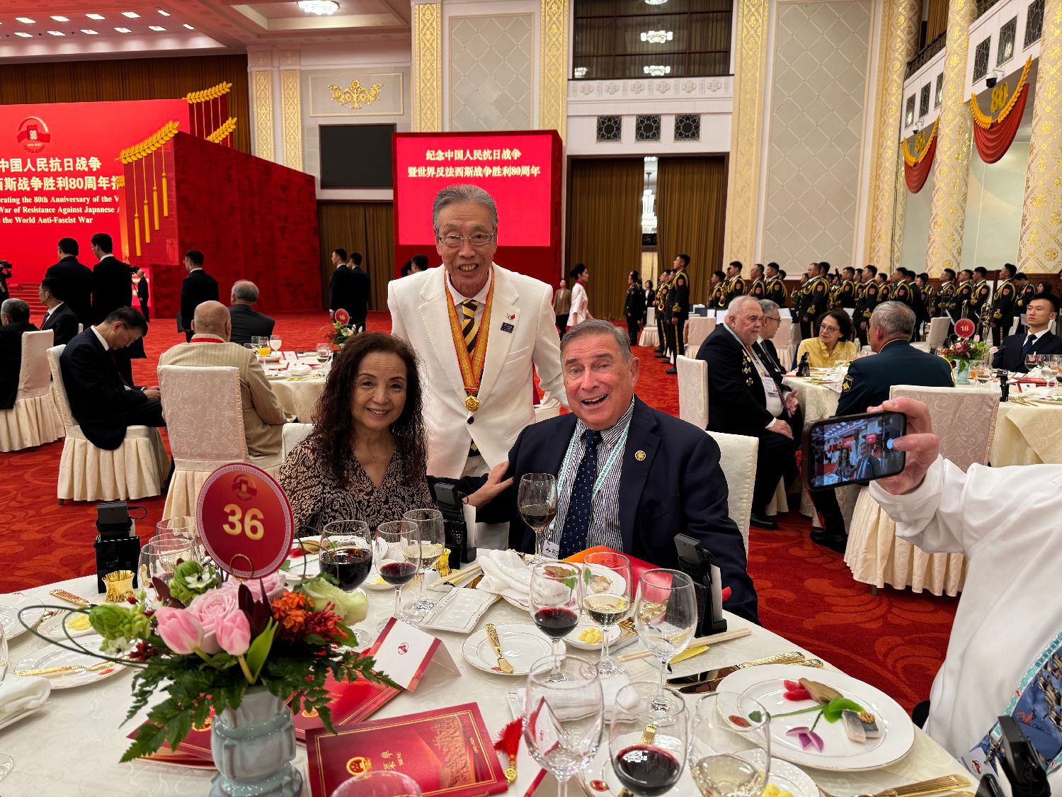 还有德国、英国、印度等国的反法西斯战士们的后代出席了国宴。其中我认识的有陈香梅的二女儿陈美丽。她和姐姐陈美华都是宋美龄给起的姓名。俄罗斯原军人扎维济奥诺夫中将和苏联元帅瓦·伊·崔可夫之孙尼·弗·崔可夫。有记录下南京大屠杀的德国医生约翰拉·贝先生的儿子托马斯·拉贝先生。还有美中航空遗产基金会主席杰弗里·格林先生,以及英国友人大卫·柯鲁克和伊莎白·柯鲁克之子柯马凯先生。法国医生贝熙叶之子贝石涛先生。印度柯隶华医生的侄孙柯隶华先生。