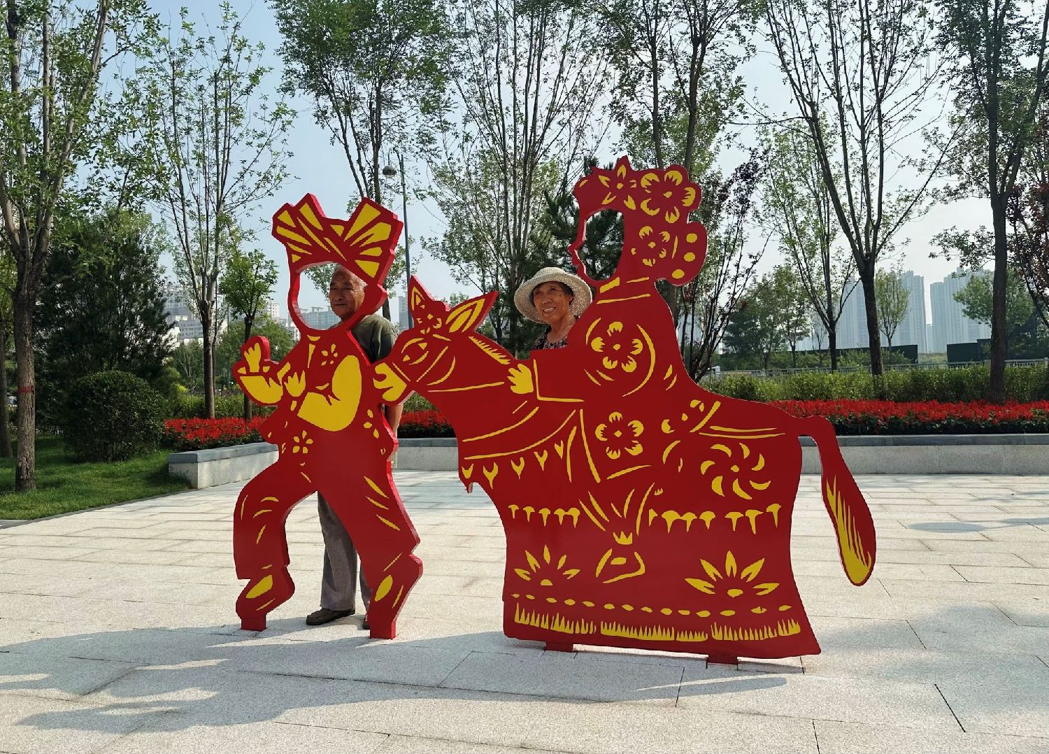 月老广场中,“囍”字、毛驴迎亲等雕塑展示传统婚俗元素,心形廊架、“LOVE”雕塑等呈现现代婚恋元素。一对对情侣、夫妻并肩散步,从青年人到老年人,都将这里作为“浪漫地标”打卡。