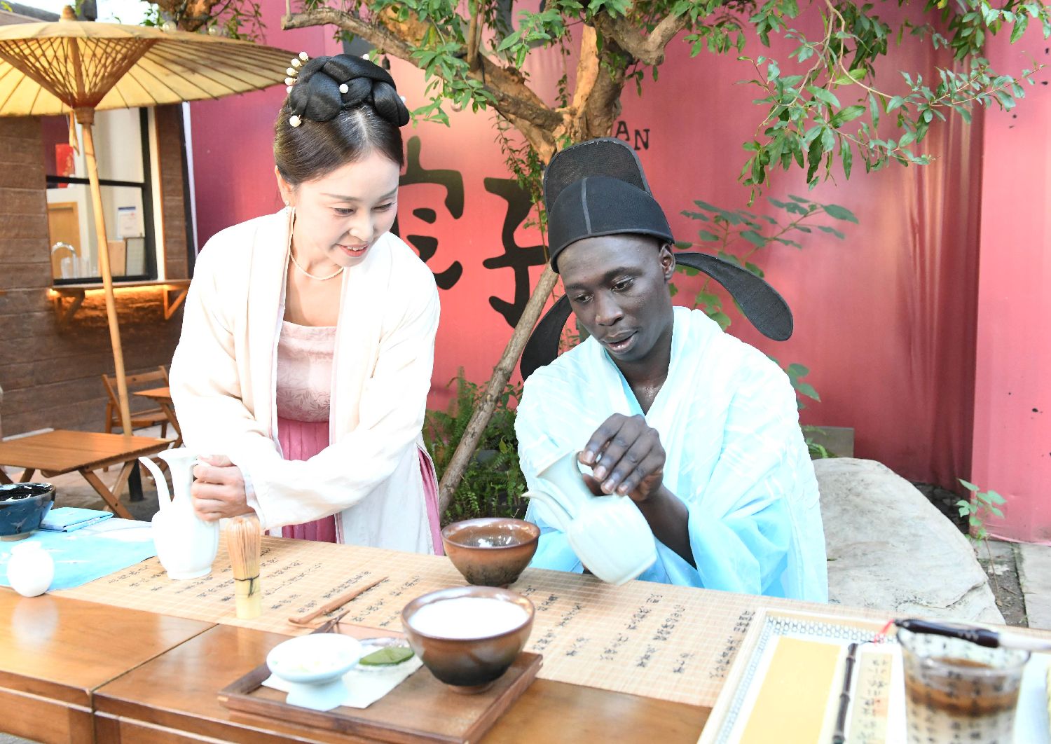 图为“无语哥”体验点茶技艺。(图/中新社)