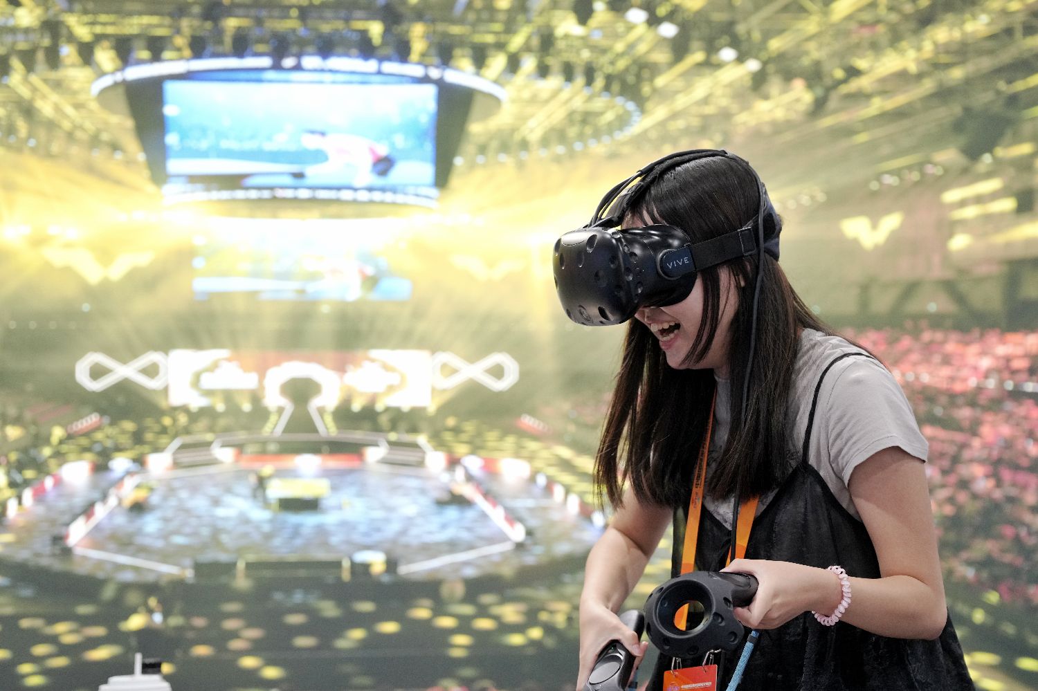 9月12日,在北京举行的2025年中国国际服务贸易交易会体育服务展现场,观众使用VR设备体验乒乓球运动。(图/中新社)