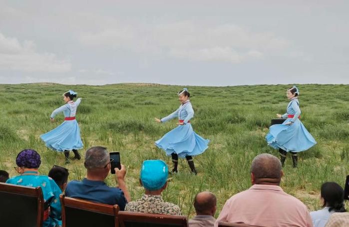 据统计,苏尼特右旗乌兰牧骑平均每年演出150余场,其中约85%是在基层,“订单式演出”也很常见,给高寿牧民集体祝寿,以及那达慕、基层比赛等,都会邀请乌兰牧骑助兴演出。
